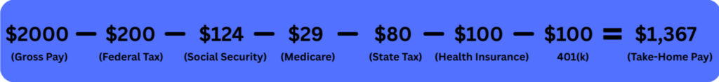 Out of a $2,000 paycheck, this employee takes home $1,367 after taxes and deductions. That’s a difference of over $600—which is why understanding your deductions is so important.